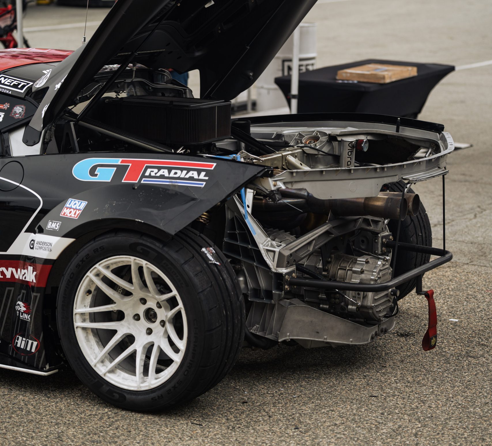 This transmission, optimized for high-performance rear-engine applications, uses straight-cut gears with dog engagement, eliminating the synchronizers that often fail when production-style manual transmissions are used in competition. That design makes it especially well-suited to the harsh, shock-loaded drivetrain conditions common in drifting.