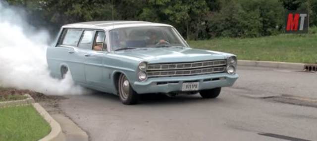ford station wagon doing a burnout
