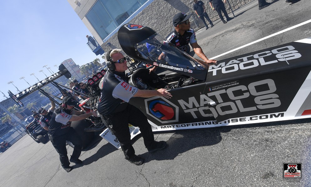Antron Brown top fuel NHRA team pushing dragster to starting line